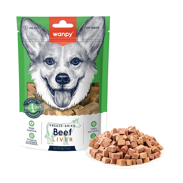 Wanpy Dog Freeze Dried Beef Liver Treat 40g is a single-ingredient, high-protein snack made from 100% natural beef liver, freeze-dried to lock in nutrients and flavor. It is a healthy, grain-free option designed to human consumption standards.
